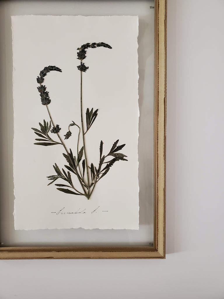 - Hand-pressed lavender is pressed by hand for 6-12 weeks and mounted onto rag paper